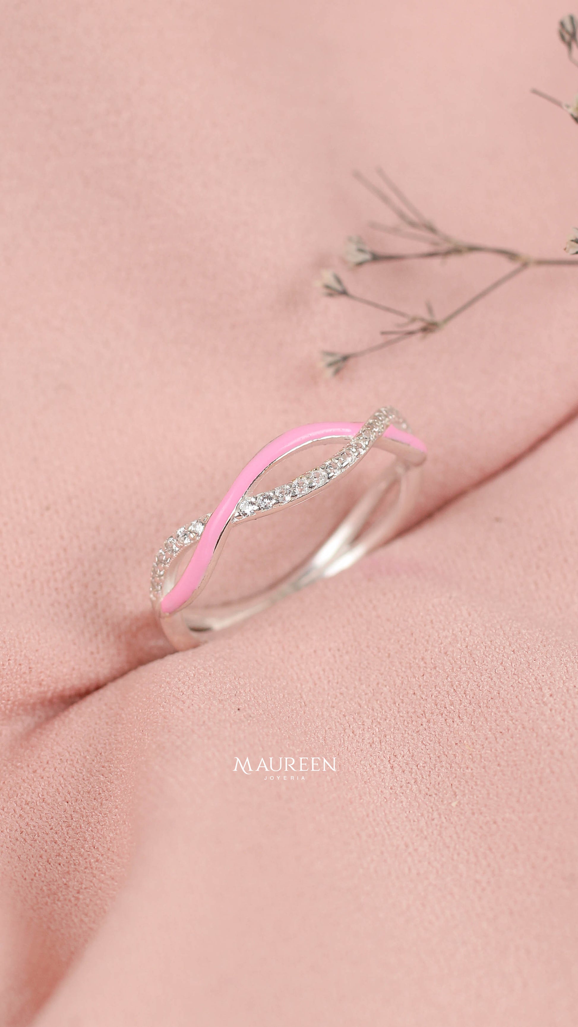 Anillo 5 ondas esmaltado rosado y con circones - plata