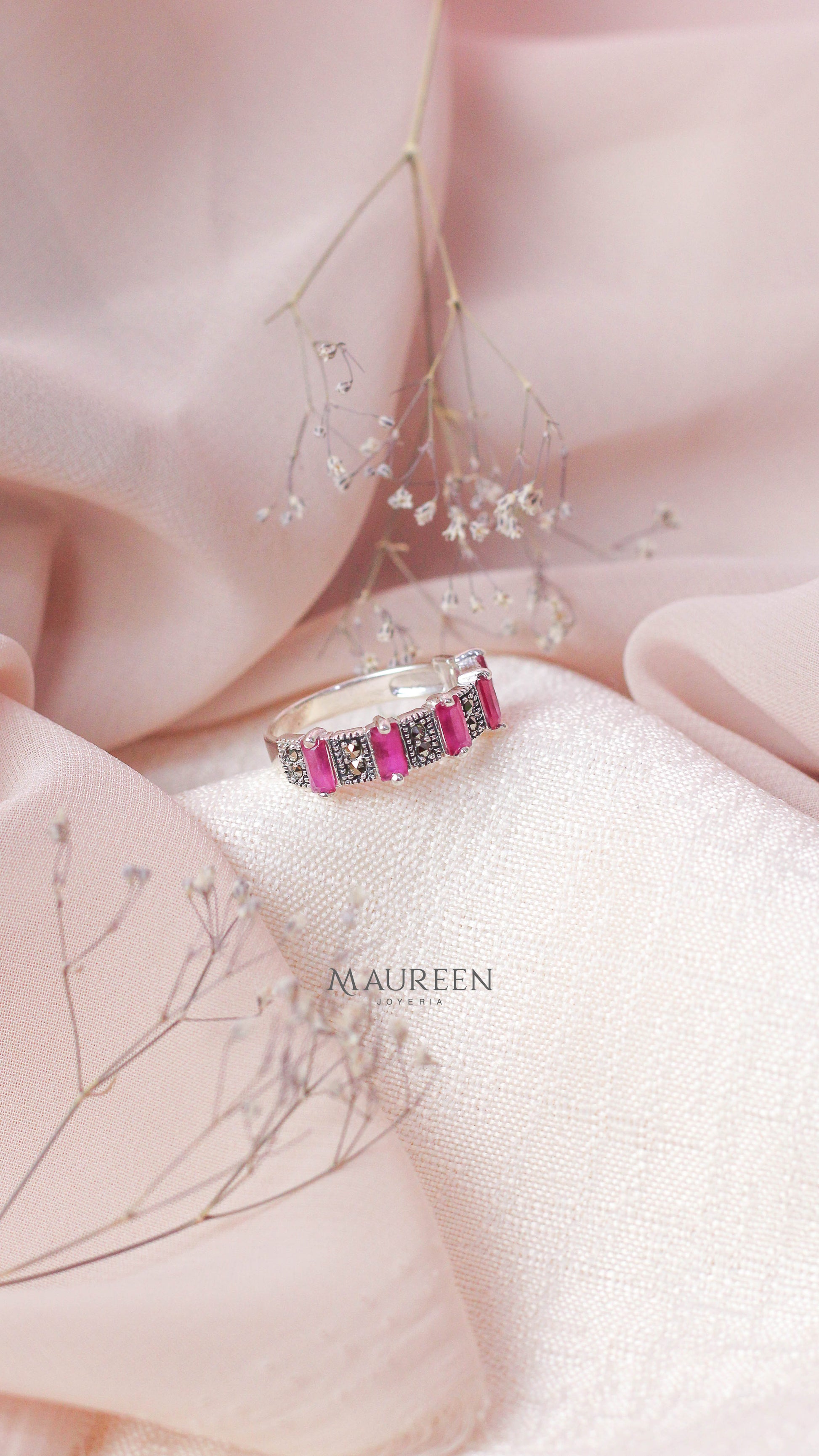 Anillo marquesita 5 rubi rectangulares - plata