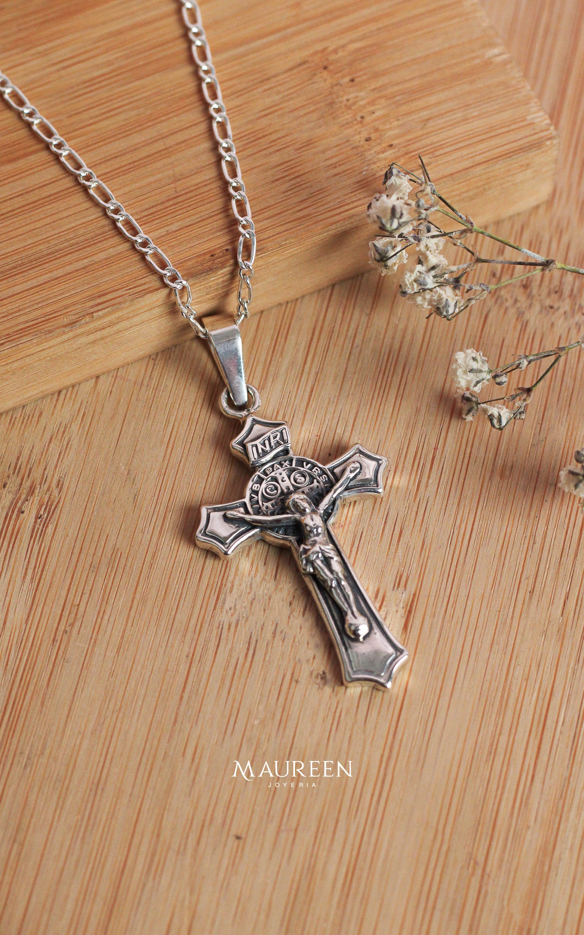 Dije cruz san benito INRI - plata quemada