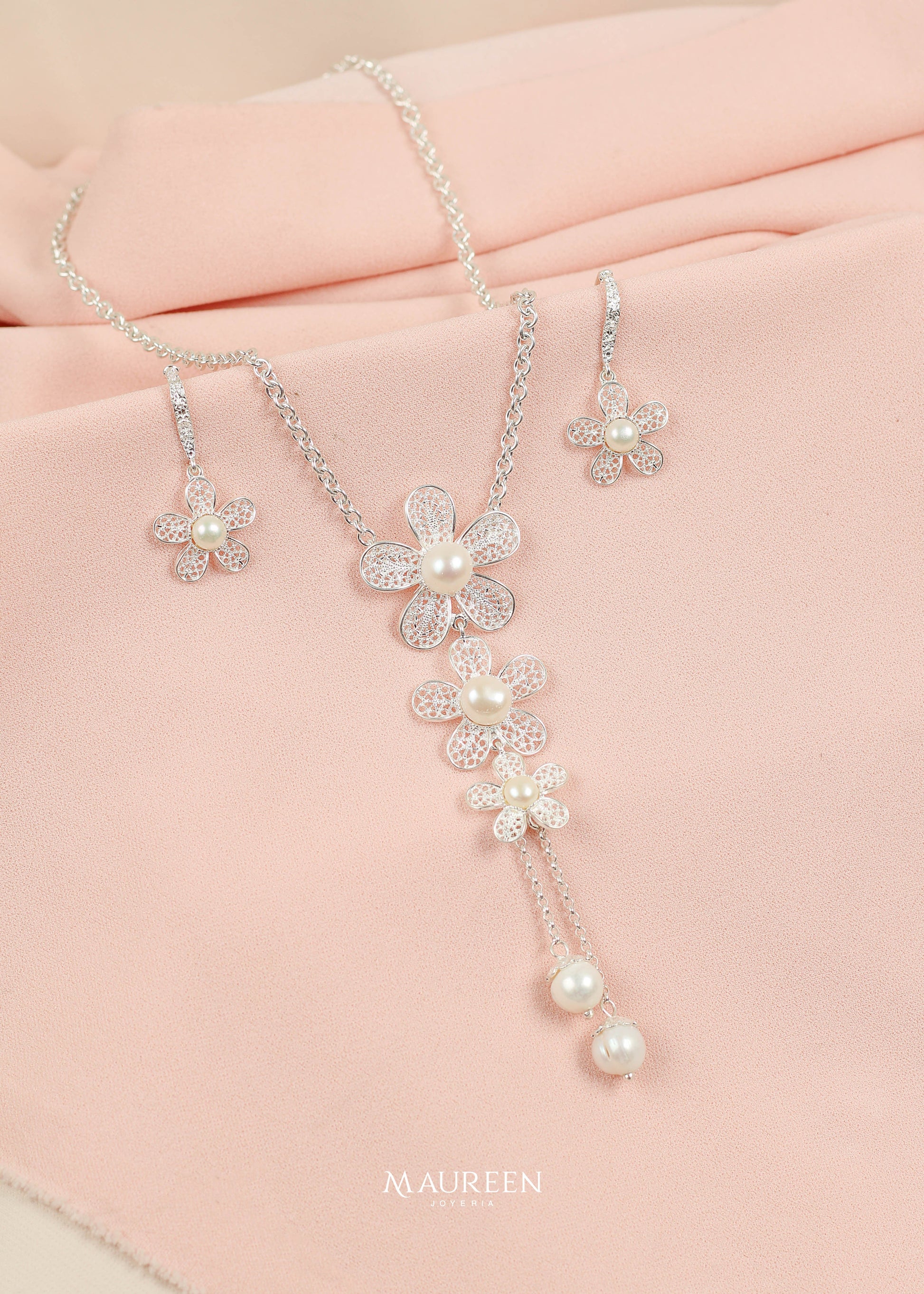 Juego flor filigrana con perlas collar y aretes colgante - Plata