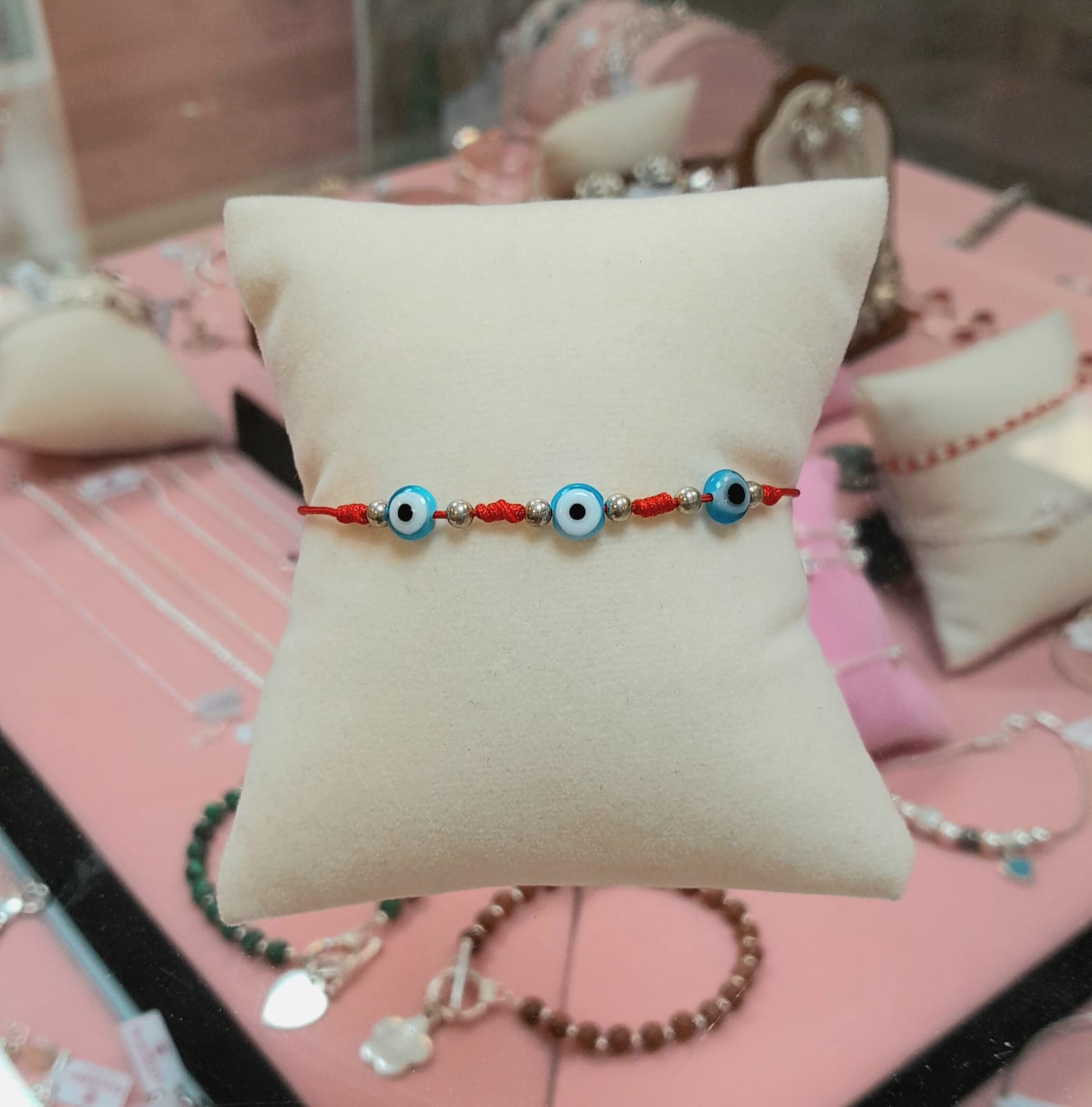 Pulsera ajustable ojos turcos celeste hilo rojo - Plata